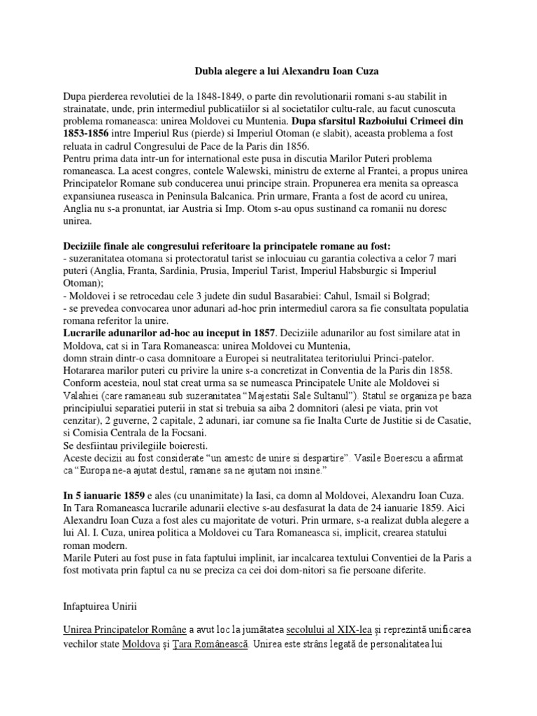 Marile puteri au fost puse in fata faptului implinit, iar incalcarea textului conventiei de la paris a fost motivata prin faptul ca nu se preciza ca cei. Dubla alegere a lui cuza. Dubla alegere a colonelului alexandru ioan cuza domn al moldovei, la 5/17 ianuarie 1859, şi , apoi, al ţării româneşti la 12/24 ianuarie 1859 a însemnat un succes hotărâtor în lupta pentru unire, dubla alegere reprezentând începutul procesului de constituire, pe baze moderne, a statului naţional român.