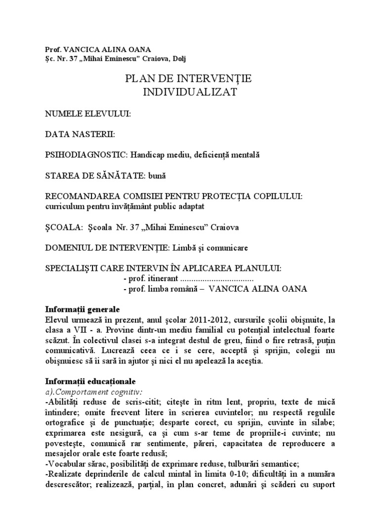 Alte persoane implicate in program: Doc program de intervenţie personalizat miana imbuzan. Articole din plan de interventie personalizat scrise de 3servicii. Planul de intervenţie corespunde nevoii de abordare cât mai individualizată a problemelor identificate la un moment dat. Alcatuirea planului de interventie individualizat este deosebit de important pentru succesul terapiei.