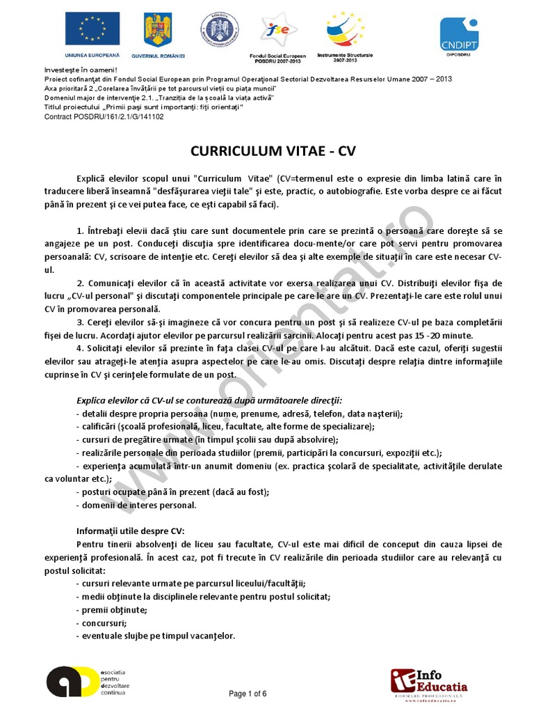 Un curriculum vitae (cv) este un document scurt, de una sau maximum doua pagini, care iti rezuma experienta profesionala, setul de abilitati si asta inseamna ca un cv standard, redactat pentru un post anume, va fi la fel de eficient ca unul personalizat. How to write a curriculum vitae even if you have no experience.