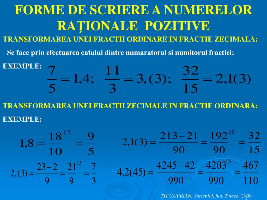 În matematică, un număr rațional (sau în limbaj mai puțin riguros, o fracție) este un număr real care se poate exprima drept raportul a două numere întregi, de obicei scris sub formă de fracție ordinară: Scrieți sub formă de fracție zecimală 7 supra 4 formă blog. Multimea numerelor rationale se noteaza cu q si contine numere fie scrise sub forma de fractie ordinara, fie sub forma de fractie zecimala.